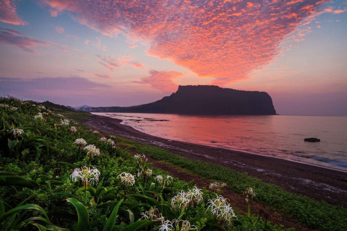 These elegant white lilies bloom in clusters between late July and early September, cascading along the rocky shorelines like folds of silk caught in the sea breeze. Standing across the water, you can almost imagine the island dusted with snow in midsummer—delicate petals reflecting the sunlight, their scent carried softly across the waves. Rabbit Island remains the only natural colony of this flower in Korea, making it both a protected treasure and a poetic secret of Jeju’s east coast.